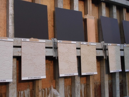 写真は、外壁を構成するガルバリウム鋼板(上段)とジョリパット(下段)という2種類の素材を並べてみたところ。