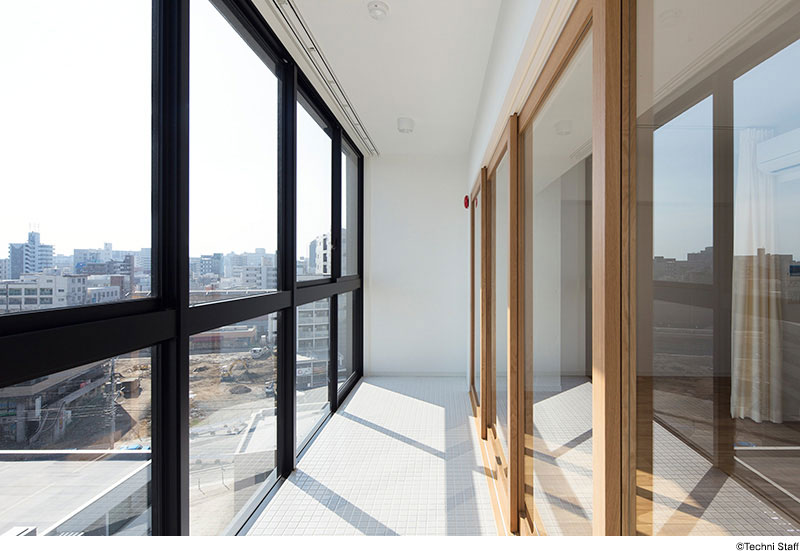 - マンション特有のバルコニーによるまちなみの風景を変えたいと考えました。6階建て以上の共同住宅は建築基準法上、階段を2箇所以上設ける必要がありますが、ただし書きとして避難上有効なバルコニーを設置することで屋外避難階段ひとつとすることができます。