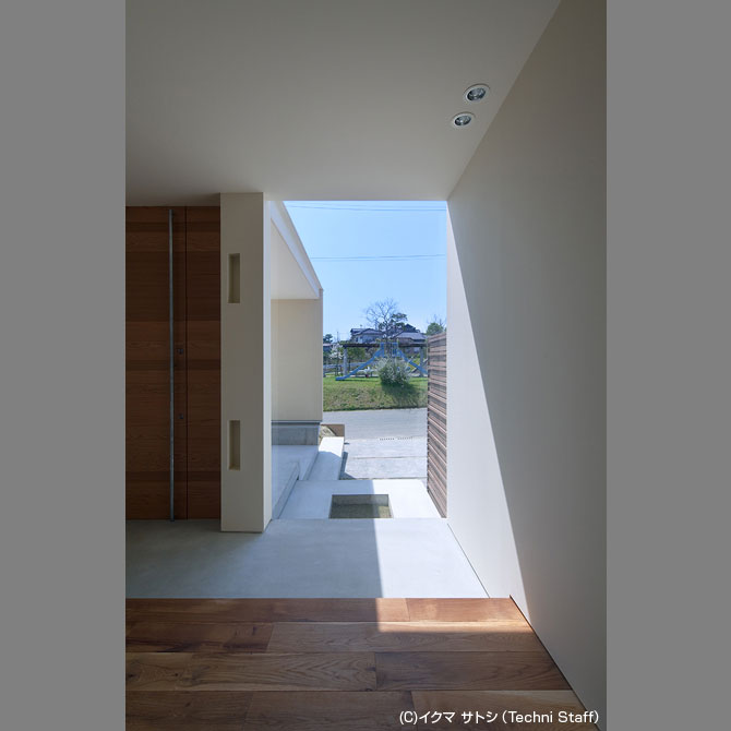 - 地域の公園に面して建つ住宅である。現場で緻密に高さを調節した2枚の木製目隠しスクリーンを公園側の1、2階テラスに設けることでプライバシーを保ちつつ開放性を確保する計画としている。