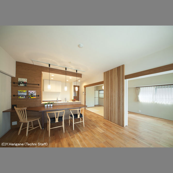 ここに住まう事を決めたご夫婦は、安全、安⼼と安らぎのある家がご希望でした。無機質なコンクリートと鉄筋で頑丈に造られたマンションだからこそ、内部は本物の⽊や⾃然素材を多く使い、場所も、⼈も呼吸がしやすい空間を⽬指しました。また、これからの⼦供たちの成⻑、家族の変化を考え、作り込まず、可変性のある間取りとしています。家族を⾒守り、家族とともにこれからも成⻑していく家です。 閉じる