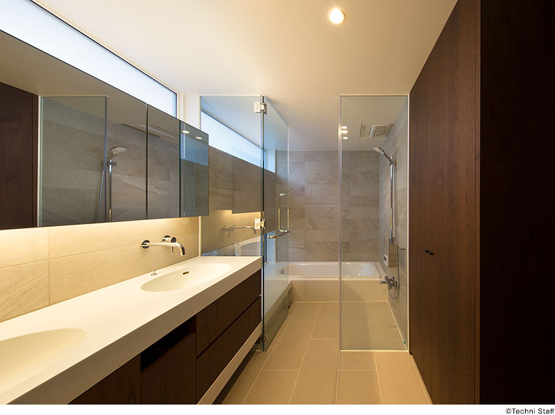 また、平屋部のリビング・ダイニングの屋根裏スペースにメインの空調機本体を吊り下げ、各室への給気及びリターンダクトによる循環、外部新鮮空気を取り入れた換気システムを含めた全館空調システムの採用により、ランニングコストを抑えた快適な室内環境が得られている。 閉じる