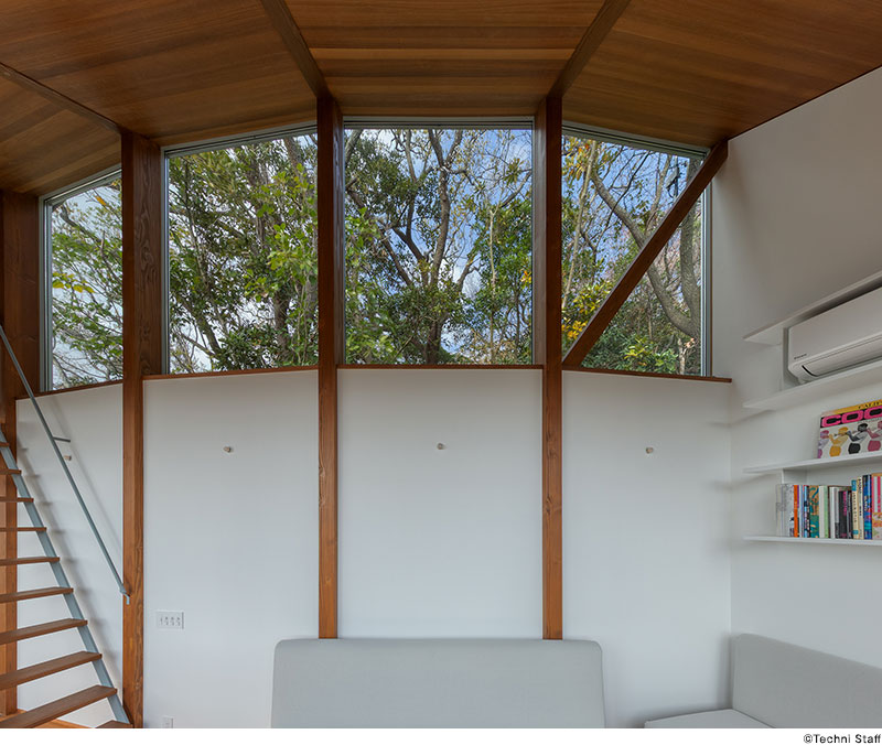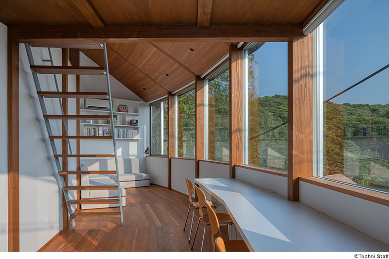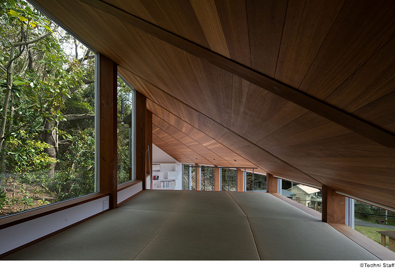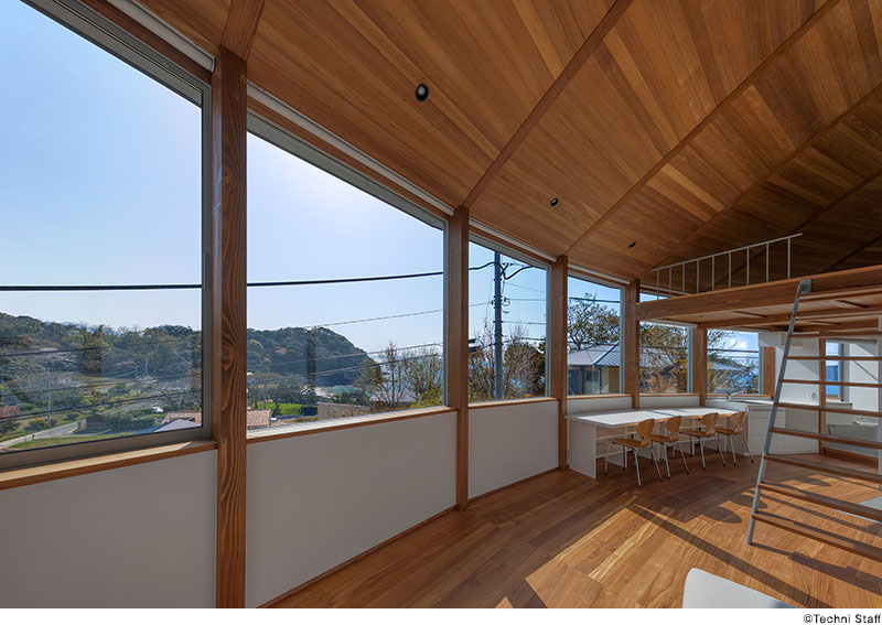 屋根は斜面をトレースするような勾配とし、山と海を身体的につなぐ。